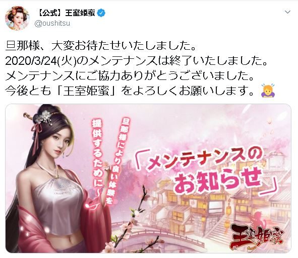 王室姫蜜は、配信されてからの期間が短いというのもありますが、比較的他のアプリと比べてもメンテナンス自体が少なく、メンテナンスに要する時間も短いように感じます。