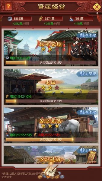 この資産経営によりゲーム進行、家臣育成に欠かせない資源を入手できることができます。