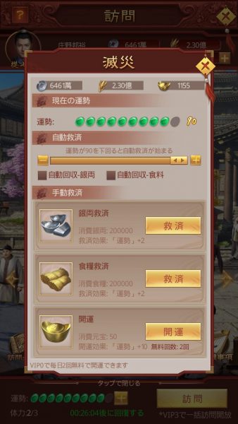 運勢が高いほど家臣や美女を見つける確率が高くなり、訪問により資源の収益になるイベントも発生しやすくなります。