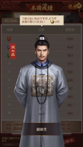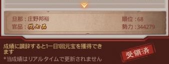 成績と皇宮での「讃辞」による獲得元宝数はおよそ200個になります。