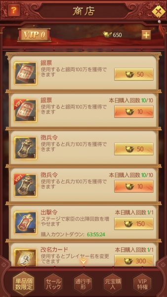 こちらの商店では銀両や兵力に交換するアイテムを購入することができます。