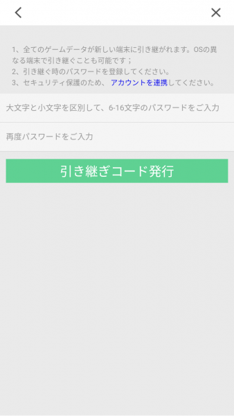 連動したデーターを別端末へ引き継いだりする場合は引き継ぎコードとパスワードが必要になりますので必ずメモなどに控えるようにして下さい。