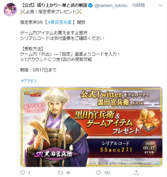 2020年5月15日から公式Twitterのほうで「黒田官兵衛」が配布されています。